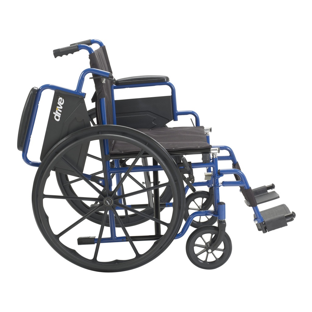 The Drive Medical Blue Streak Wheelchair series offers a blend of durability, comfort, and convenience for users seeking reliable mobility solutions. Featuring a blue powder-coated frame reinforced with a black cross brace, these wheelchairs are both sturdy and visually appealing. The flip-back, padded desk-length armrests facilitate easy transfers and provide added comfort. Durable nylon upholstery is lightweight, attractive, and easy to clean. Solid rubber tires mounted on composite wheels ensure a smooth, stable ride over most surfaces and require minimal maintenance. The Blue Streak series is available in multiple configurations to meet individual needs, including 16-inch seat width with swing-away footrests (BLS16FBD-SF) and elevating leg rests (BLS16FBD-ELR), 18-inch seat width with swing-away footrests (BLS18FBD-SF) and elevating leg rests (BLS18FBD-ELR), and 20-inch seat width with swing-away footrests (BLS20FBD-SF) and elevating leg rests (BLS20FBD-ELR). Each model supports a weight capacity of up to 250 pounds and comes with push-to-lock wheel locks for enhanced safety. The Blue Streak Wheelchair series is backed by Drive Medical’s limited three-year warranty, ensuring long-term reliability and peace of mind.