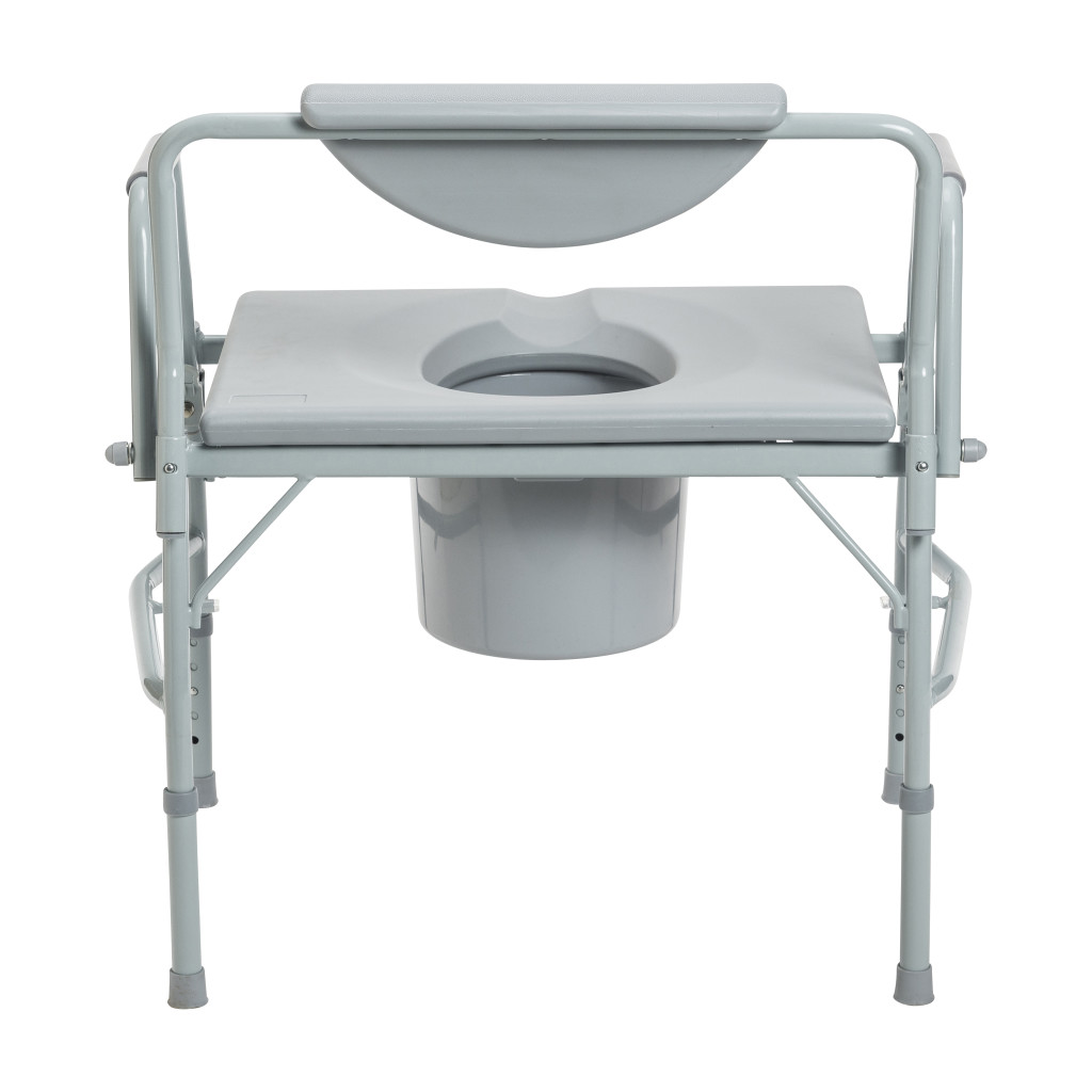 The Drive Medical Deluxe Bariatric Drop-Arm Commode (Model Number 11135-1) is a heavy-duty, versatile bathroom safety solution engineered for superior stability, comfort, and ease of use in bedside or over-toilet configurations, featuring a robust gray powder-coated steel frame that supports up to 1000 pounds while weighing just 20 pounds for effortless portability and assembly without tools in home, hospital, or long-term care settings. Its innovative easy-to-release drop-arm mechanism allows the padded armrests—spaced 25.75 inches apart—to lower and lock out of the way for safe, lateral patient transfers from wheelchairs or beds, reducing caregiver strain and enhancing independence for bariatric users, seniors, or individuals with mobility limitations, while the large, durable snap-on plastic seat measures 23.25 inches wide by 18.5 inches deep with an 8-inch by 9-inch opening for optimal hygiene access and the adjustable height from 17.5 inches to 22 inches accommodates various user statures and toilet heights via tool-free leg clips. The wide 26-inch stance between legs ensures rock-solid balance on diverse floors, complemented by non-marring rubber tips to protect surfaces, and it includes a convenient 12-quart commode pail with snap-on lid that slides in and out from the front for discreet, spill-proof disposal and cleaning. Ideal for post-surgical recovery, chronic conditions, or temporary assistance needs, this commode promotes dignity and confidence in personal care routines with its sturdy construction made from recycled materials for eco-friendly durability. Backed by Drive Medical’s limited lifetime warranty against defects in materials and workmanship for the original purchaser when acquired through authorized dealers, this essential bariatric commode delivers enduring reliability and peace of mind for long-term safety and convenience.