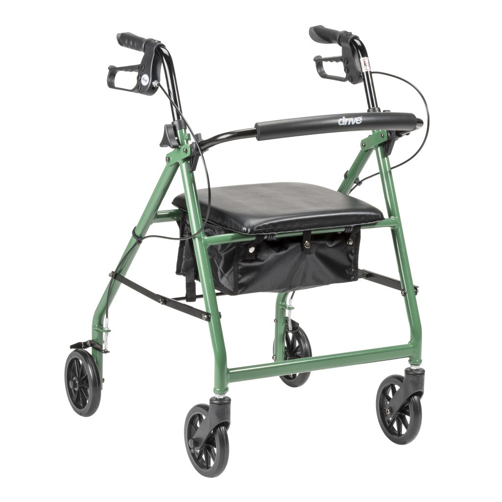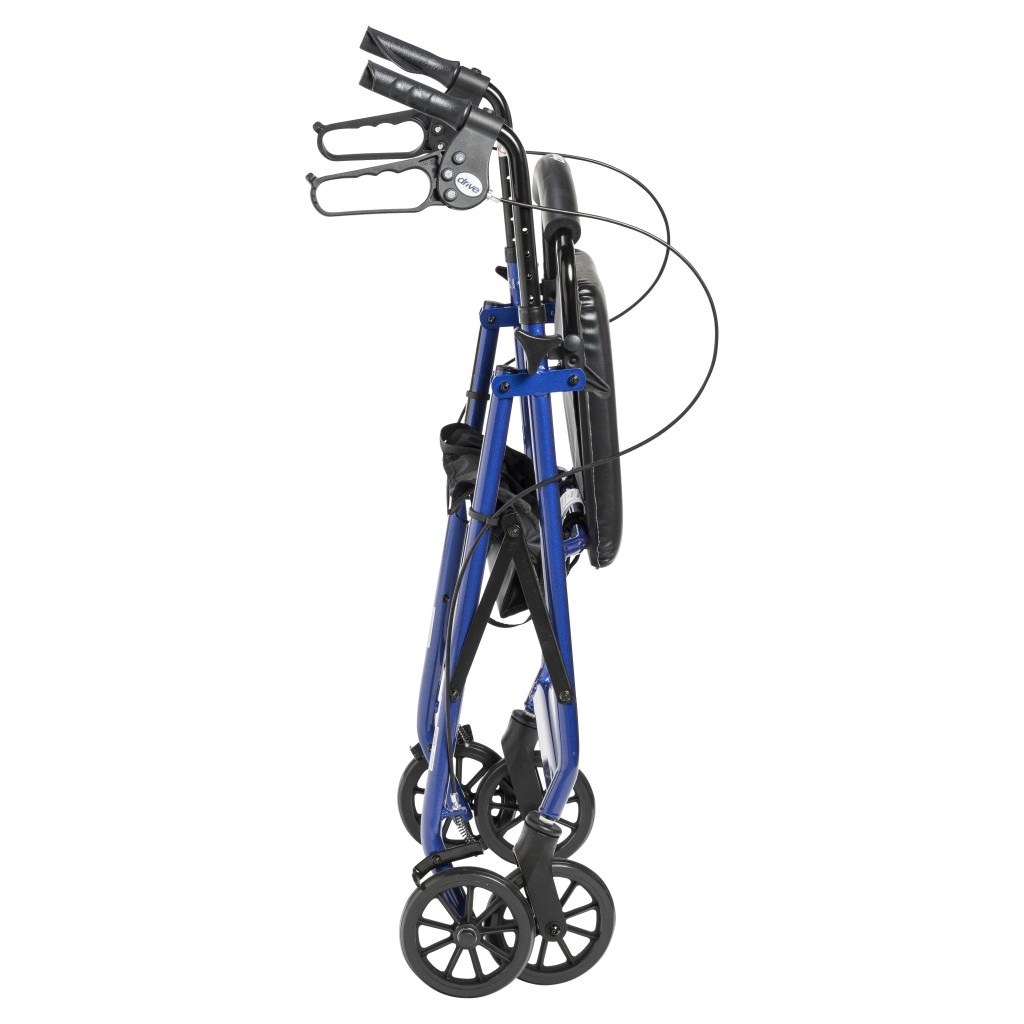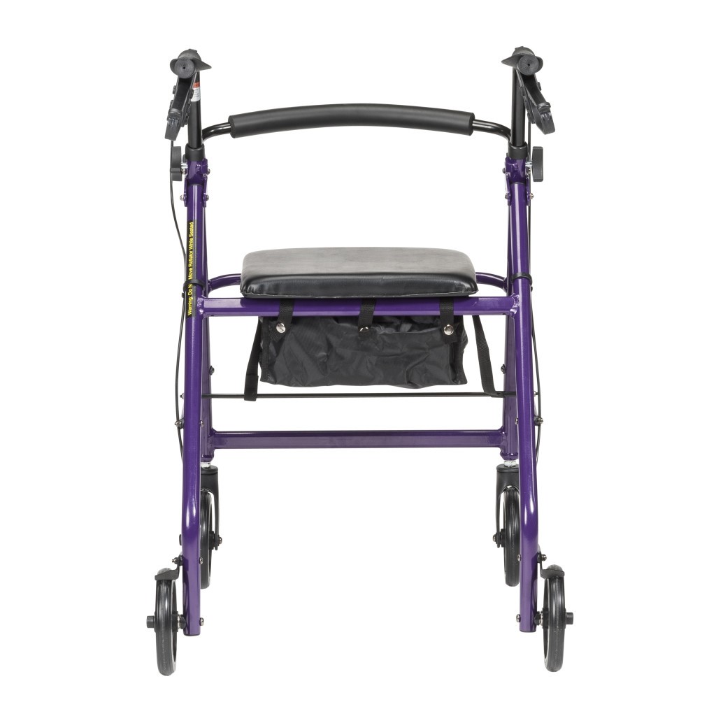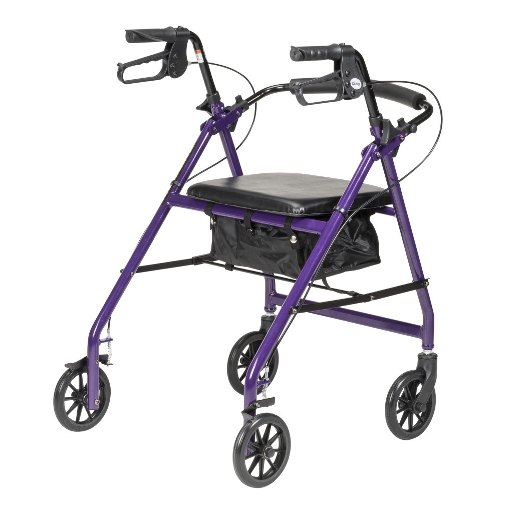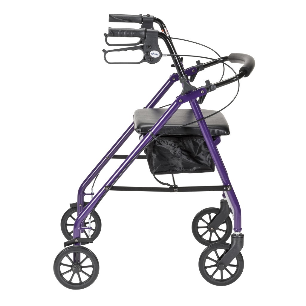 The Drive Medical Aluminum Rollator (Model R726) is a lightweight and durable mobility aid designed to enhance user comfort and safety. Weighing approximately 13 pounds, this rollator supports users up to 300 pounds. It features a seamless padded seat measuring 14 inches in width and 12 inches in depth, positioned at a height of 20 inches from the floor, providing a comfortable resting spot during use. The removable, hinged, padded backrest can be folded up or down as needed, adding versatility to the design. Equipped with 6-inch black non-marring wheels with soft grip tires, the R726 is suitable for both indoor and outdoor use. The ergonomic handles are easy to grip and can be adjusted in height from 32 to 37 inches to accommodate various user preferences. Safety features include easy-to-use deluxe loop locks and serrated brakes for a firm hold. A zippered pouch under the seat offers added privacy and security for personal items. The rollator is available in five attractive colors: black (R726BK), blue (R726BL), red (R726RD), green (R726GR), and purple (R726PR). Backed by Drive Medical’s limited lifetime warranty, the R726 provides reliable support and convenience for daily mobility needs.