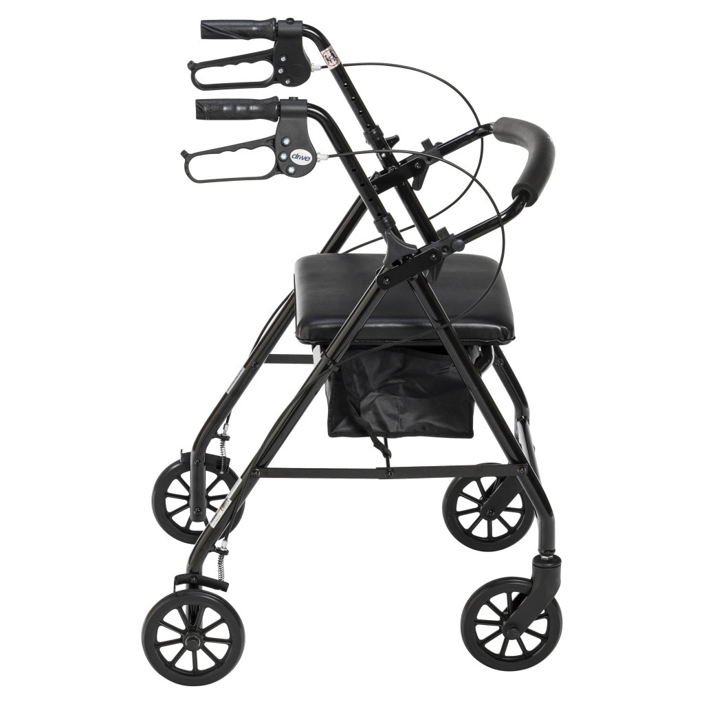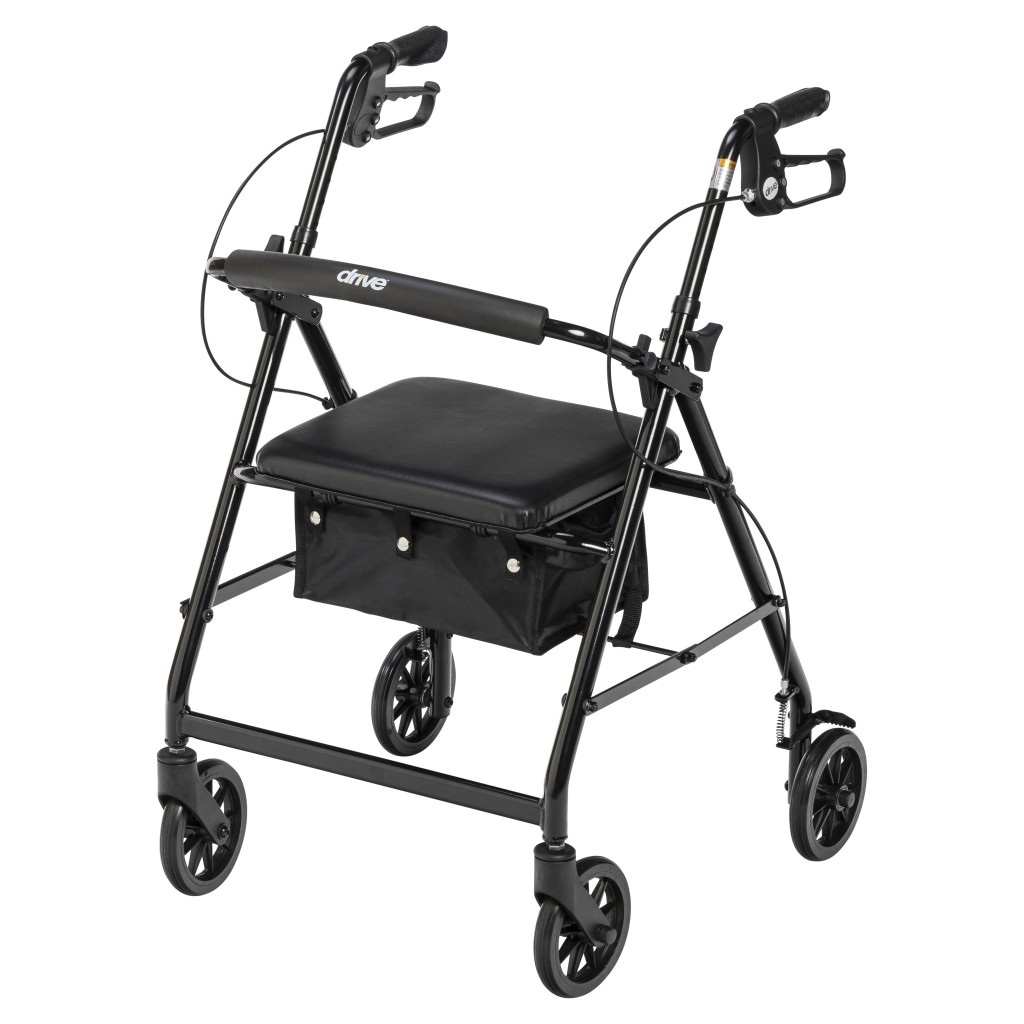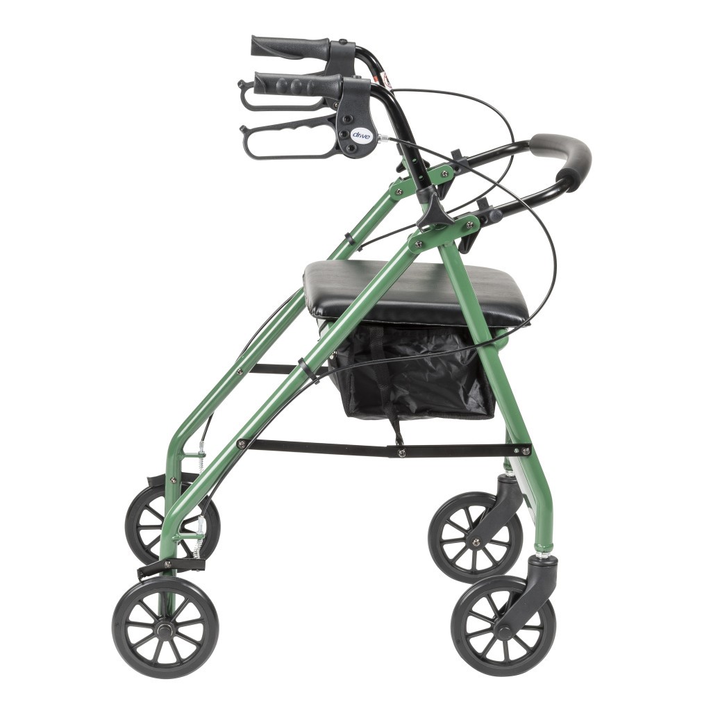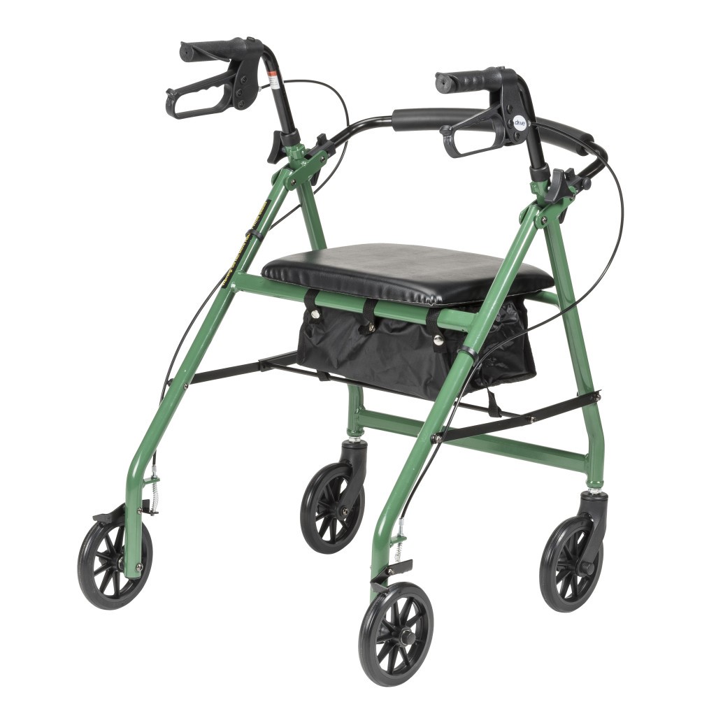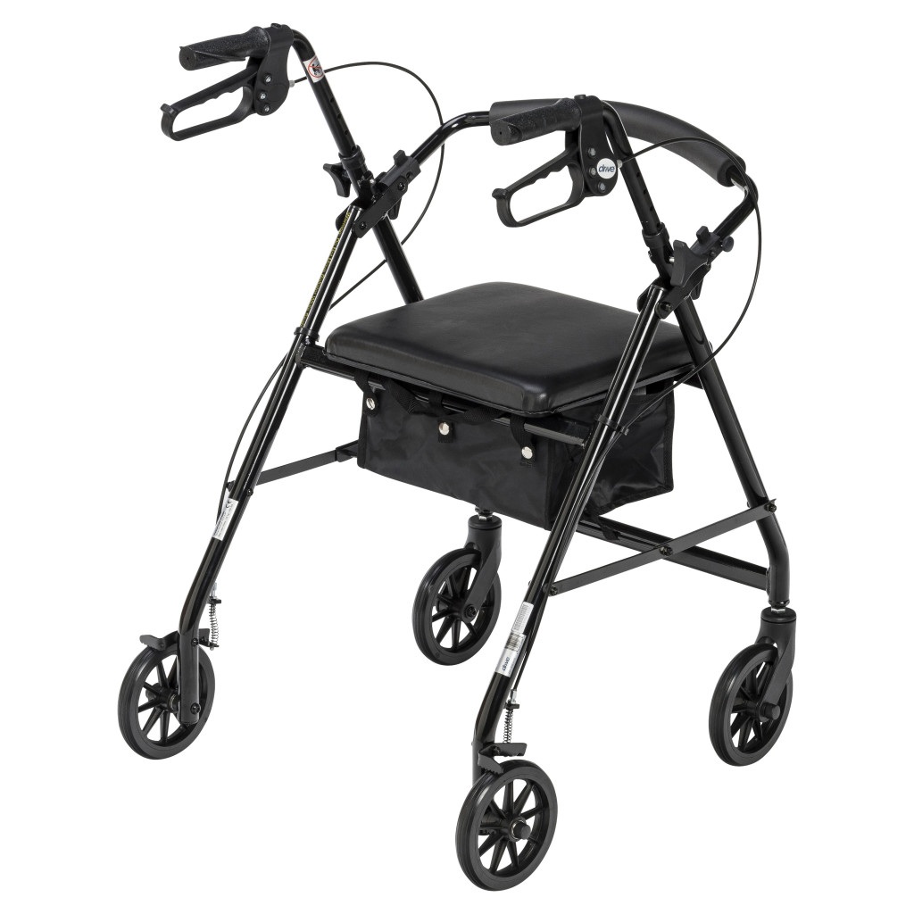 The Drive Medical Aluminum Rollator (Model R726) is a lightweight and durable mobility aid designed to enhance user comfort and safety. Weighing approximately 13 pounds, this rollator supports users up to 300 pounds. It features a seamless padded seat measuring 14 inches in width and 12 inches in depth, positioned at a height of 20 inches from the floor, providing a comfortable resting spot during use. The removable, hinged, padded backrest can be folded up or down as needed, adding versatility to the design. Equipped with 6-inch black non-marring wheels with soft grip tires, the R726 is suitable for both indoor and outdoor use. The ergonomic handles are easy to grip and can be adjusted in height from 32 to 37 inches to accommodate various user preferences. Safety features include easy-to-use deluxe loop locks and serrated brakes for a firm hold. A zippered pouch under the seat offers added privacy and security for personal items. The rollator is available in five attractive colors: black (R726BK), blue (R726BL), red (R726RD), green (R726GR), and purple (R726PR). Backed by Drive Medical’s limited lifetime warranty, the R726 provides reliable support and convenience for daily mobility needs.