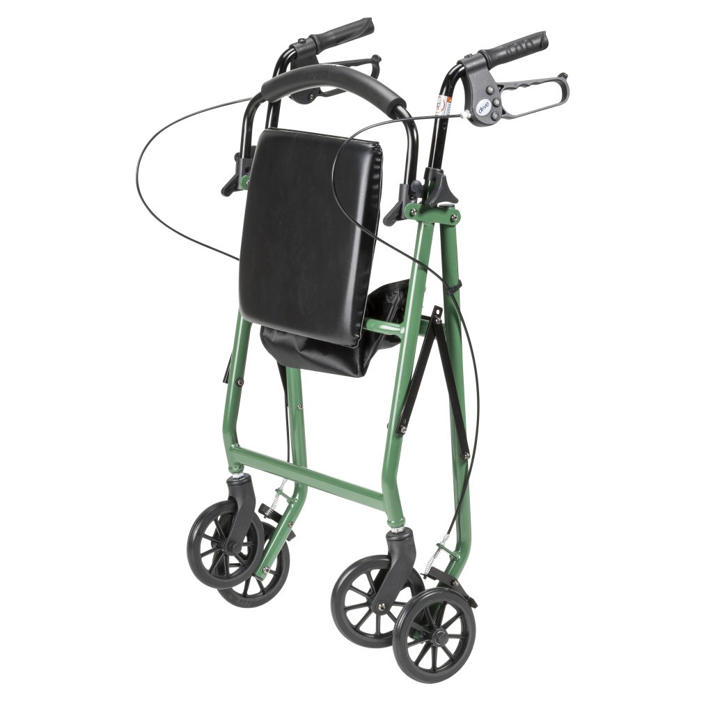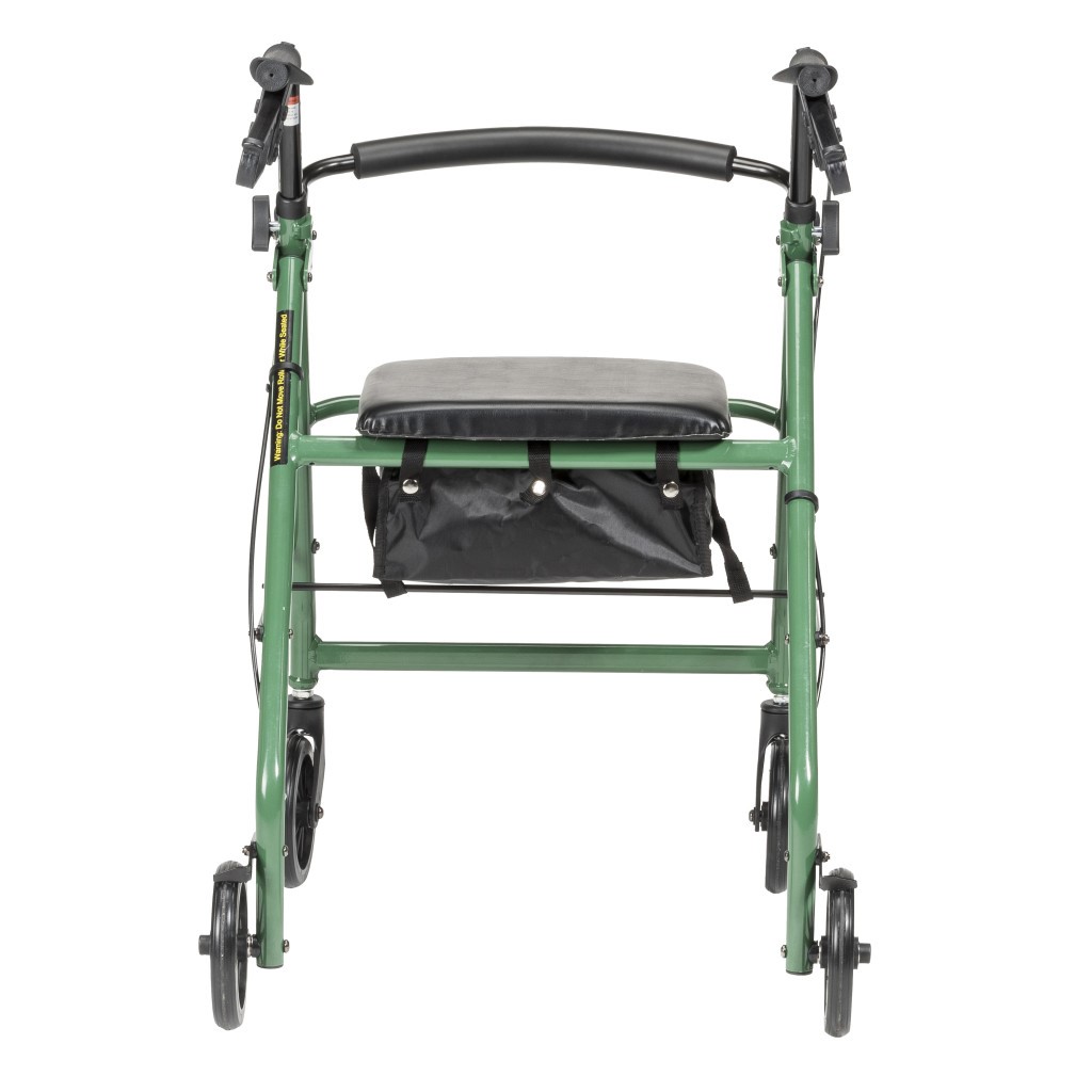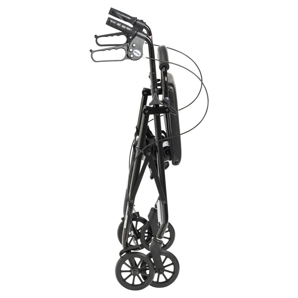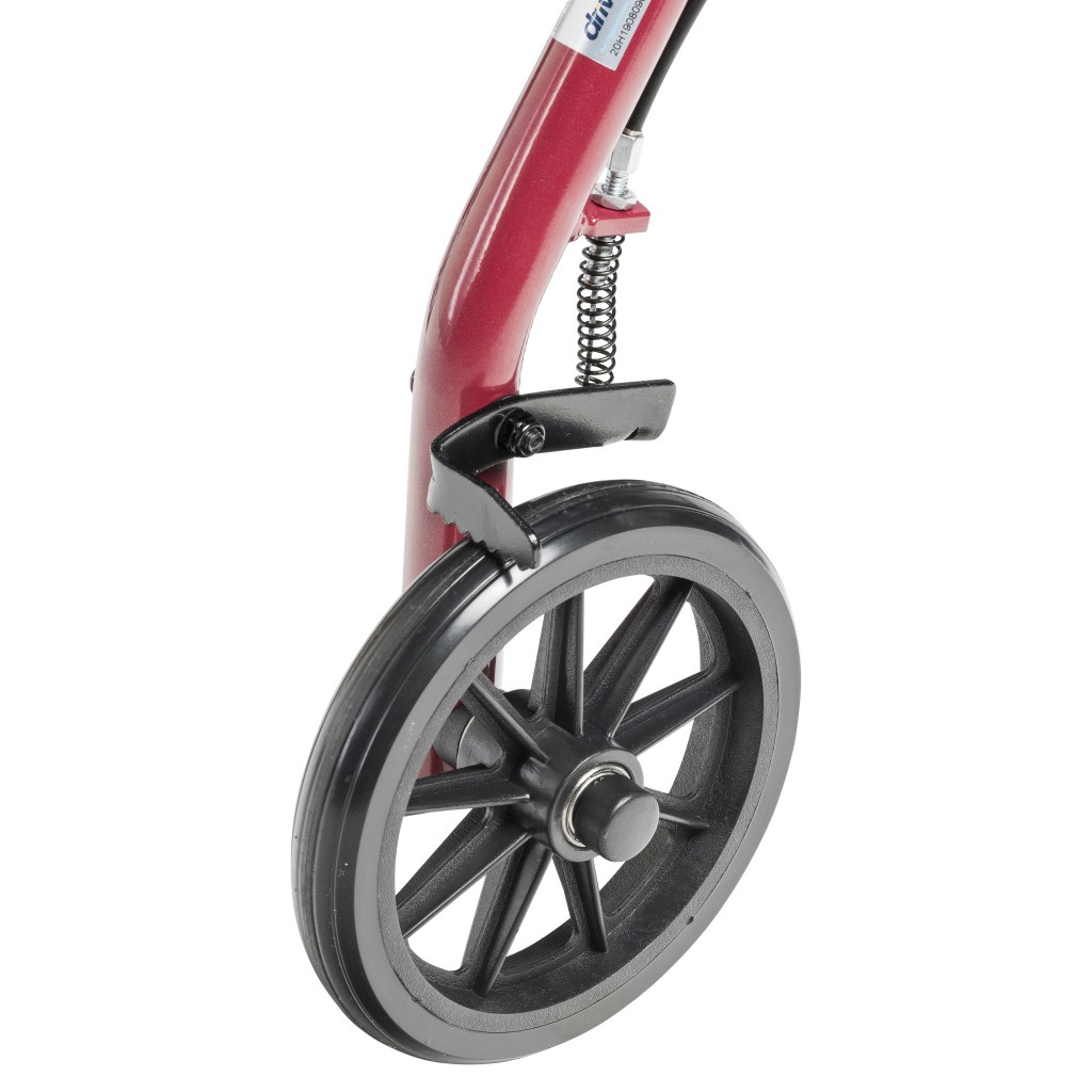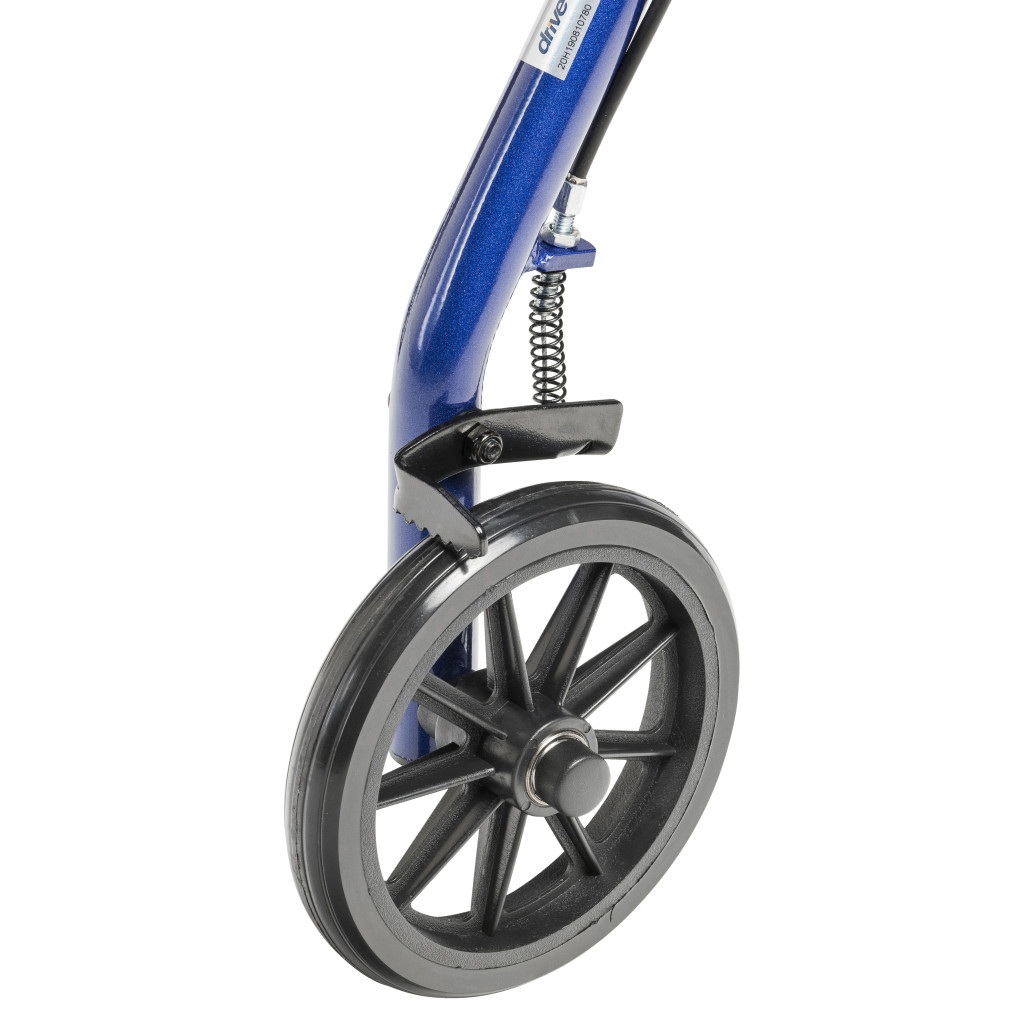The Drive Medical Aluminum Rollator (Model R726) is a lightweight and durable mobility aid designed to enhance user comfort and safety. Weighing approximately 13 pounds, this rollator supports users up to 300 pounds. It features a seamless padded seat measuring 14 inches in width and 12 inches in depth, positioned at a height of 20 inches from the floor, providing a comfortable resting spot during use. The removable, hinged, padded backrest can be folded up or down as needed, adding versatility to the design. Equipped with 6-inch black non-marring wheels with soft grip tires, the R726 is suitable for both indoor and outdoor use. The ergonomic handles are easy to grip and can be adjusted in height from 32 to 37 inches to accommodate various user preferences. Safety features include easy-to-use deluxe loop locks and serrated brakes for a firm hold. A zippered pouch under the seat offers added privacy and security for personal items. The rollator is available in five attractive colors: black (R726BK), blue (R726BL), red (R726RD), green (R726GR), and purple (R726PR). Backed by Drive Medical’s limited lifetime warranty, the R726 provides reliable support and convenience for daily mobility needs.