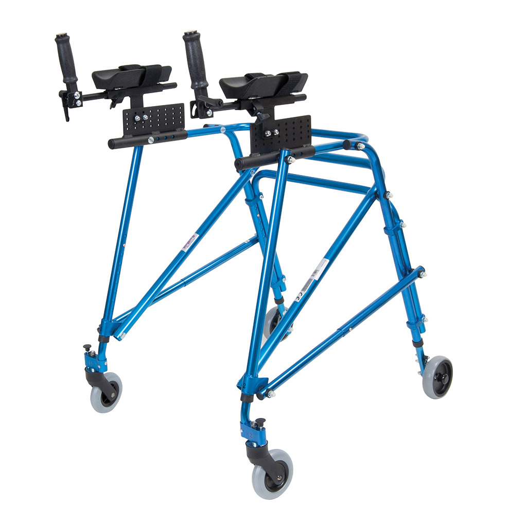 The Drive Medical Forearm Platforms for Nimbo Walker, available in models KA 1035FPS (small, 5 inches long, 3.5-4.5 inches height from handlebar to armrest) and KA 1035FPL (large, 8 inches long, 5-7.5 inches height from handlebar to armrest), are lightweight aluminum accessories designed to enhance the functionality of Nimbo Posterior Walkers for pediatric and adult users who cannot use standard hand grips due to limited wrist strength or other mobility challenges, featuring contoured armrests with flexible edges and hook-and-loop fastener straps to securely hold arms in place, preventing slippage, and adjustable handgrips that extend forward or backward, supinate, pronate, and are angle-adjustable for personalized comfort. These platforms offer mounting options inside or outside the handlebar with included spacers for additional lateral range, making them ideal for users requiring customized arm support in therapy or daily activities, and are compatible with all Nimbo Posterior Walker models, available as a pair through various retailers, requiring minimal assembly and meeting safety standards for reliable performance. Drive Medical provides a one-year limited warranty covering defects in materials and workmanship under normal use for the original purchaser, ensuring confidence in their durability and functionality.