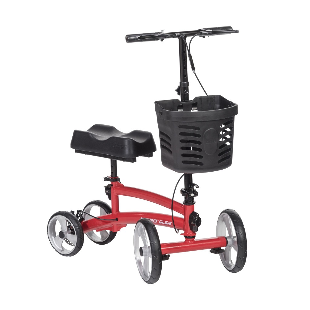 The Drive Medical Nitro Glide Knee Walker is an innovative and comfortable mobility solution designed for individuals recovering from foot or ankle injuries, surgery, or conditions that limit walking ability. This knee walker offers an alternative to crutches, allowing users to maintain their independence and mobility while recovering. Available in two stylish color options—Red (791RD) and Blue (791BL)—the Nitro Glide Knee Walker is designed for both indoor and outdoor use, providing a smooth, stable ride on a variety of surfaces. Equipped with large 12-inch wheels, this knee walker offers excellent maneuverability, allowing users to easily navigate through tight spaces and over uneven terrain. The height-adjustable handlebar and padded knee platform ensure a customized, comfortable fit, while the ergonomic design helps reduce strain on the knee and leg during use. The knee platform is contoured and cushioned for added comfort, providing ample support for the injured leg. For added safety and convenience, the Nitro Glide Knee Walker features responsive hand brakes for smooth stopping, and the easy-to-use lock mechanism ensures the walker remains stationary when needed. The walker folds quickly for compact storage and easy transport, making it ideal for travel or when space is limited. Additionally, the sturdy frame offers exceptional durability, making the knee walker reliable for long-term use. Perfect for individuals recovering from surgery or injury, the Drive Medical Nitro Glide Knee Walker offers a comfortable, practical, and stylish mobility solution. With its smooth glide, secure braking system, and compact design, this knee walker allows users to regain mobility with ease. Drive Medical stands behind the quality and reliability of the Nitro Glide Knee Walker with a limited lifetime warranty, ensuring long-lasting performance and customer satisfaction.