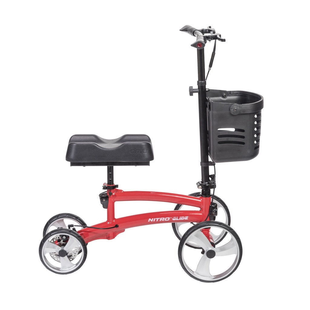 The Nitro™ Knee Walker offers users recovering from a below-the-knee injury the ability to remain mobile and glide through their daily activities in an all-new sleek design. Offered in two vibrant colors, this patented design features width expanding front axels to provide the user with adjustability and support to meet desired turning radius when navigating in different indoor and outdoor settings. The ergonomic design of the adjustable knee pad provides the necessary comfort and elevation to the injured leg while the adjustable handlebar also accommodates to user preference. The lightweight frame safely encloses the brake cable inside to enhance its modern design and the foldable feature makes it convenient for storage and transport.