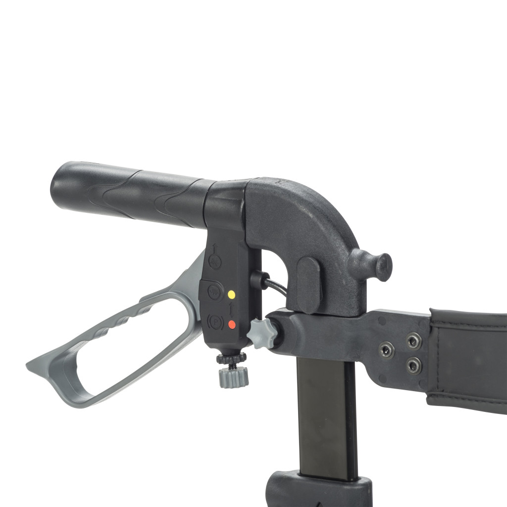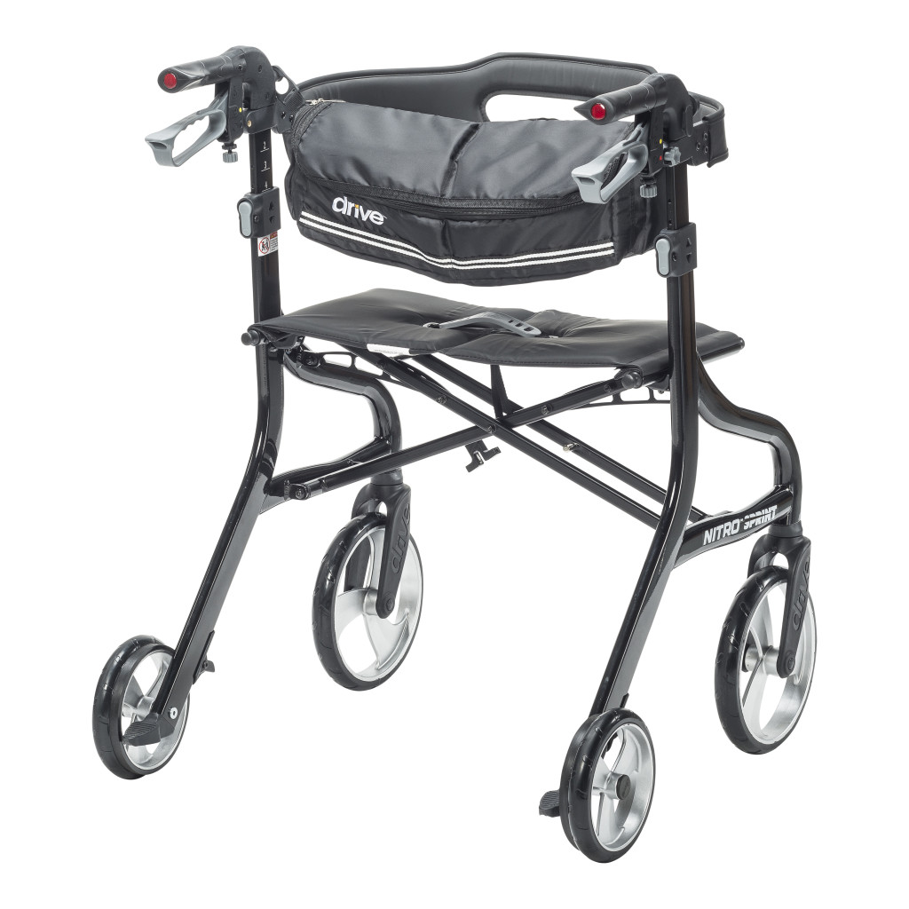 The sleek Nitro Sprint Rollator is designed to provide comfort, convenience, and control at every turn. The rollator sports a unique braking system that reduces tire wear and has an integrated slow-down brake for safer maneuverability over diverse terrain. When not in use, the rollator can be folded side to side with one hand and locked in place for easy transport. Other features include multiple storage bag mounting points and a wider backrest with a window for improved comfort and visibility.