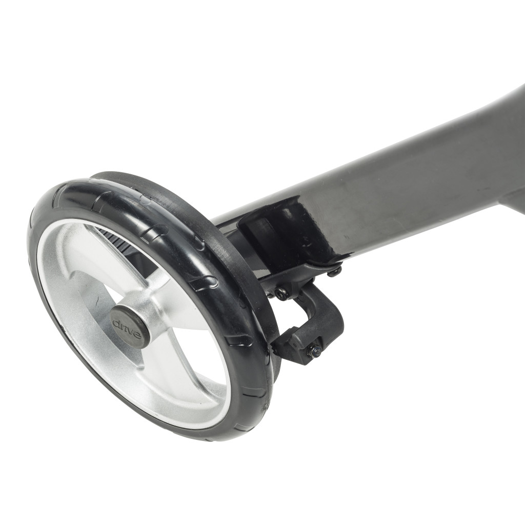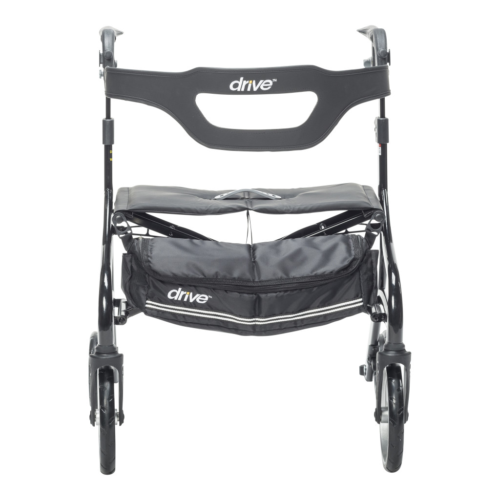 The Drive Medical Nitro Sprint HD Rollator (Model Number 102662BK-HD) is a heavy-duty, bariatric mobility aid engineered for exceptional stability, comfort, and effortless navigation in both indoor and outdoor settings, boasting a durable aluminum frame weighing just 24 pounds while accommodating up to 500 pounds for reliable support tailored to larger users, all wrapped in a sophisticated black finish that elevates its modern, unobtrusive aesthetic. Its four-wheel configuration features oversized 10-inch front casters with soft-grip tires for superior shock absorption and maneuverability across uneven terrains like sidewalks, carpets, or thresholds, complemented by ergonomic hand grips that adjust in one-inch increments from 33 inches to 38 inches for a personalized, fatigue-reducing fit, alongside a generously proportioned 20-inch wide by 12-inch deep padded seat positioned at 21 inches high for secure, comfortable resting during extended outings. Integrated with Drive Medical’s innovative braking system—including responsive push-down hand brakes for precise stopping, an auxiliary slow-down brake for controlled descent on slopes, and concealed cables for a sleek, snag-resistant profile—this rollator ensures safer mobility without compromising style or ease, while a removable zippered storage pouch measuring 15 inches wide by 9 inches high by 7 inches deep offers ample space for essentials such as medications, groceries, or personal items. The intuitive one-handed side-to-side folding mechanism allows it to collapse compactly and lock in place for seamless transport in vehicles or storage in tight spaces, promoting independence for seniors, rehabilitation patients, or individuals with chronic mobility needs during daily errands, walks, or social engagements, and it arrives pre-assembled for immediate use with optional accessories like cup holders or trays available to further enhance versatility. Backed by Drive Medical’s limited lifetime warranty on the frame and a five-year limited warranty on the brake handle and housing against defects in materials and workmanship for the original purchaser when acquired through authorized dealers, this rollator delivers enduring quality and peace of mind for long-term performance.