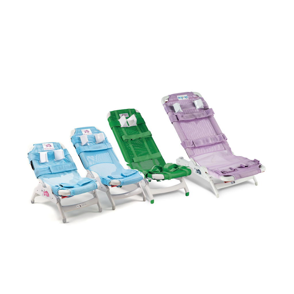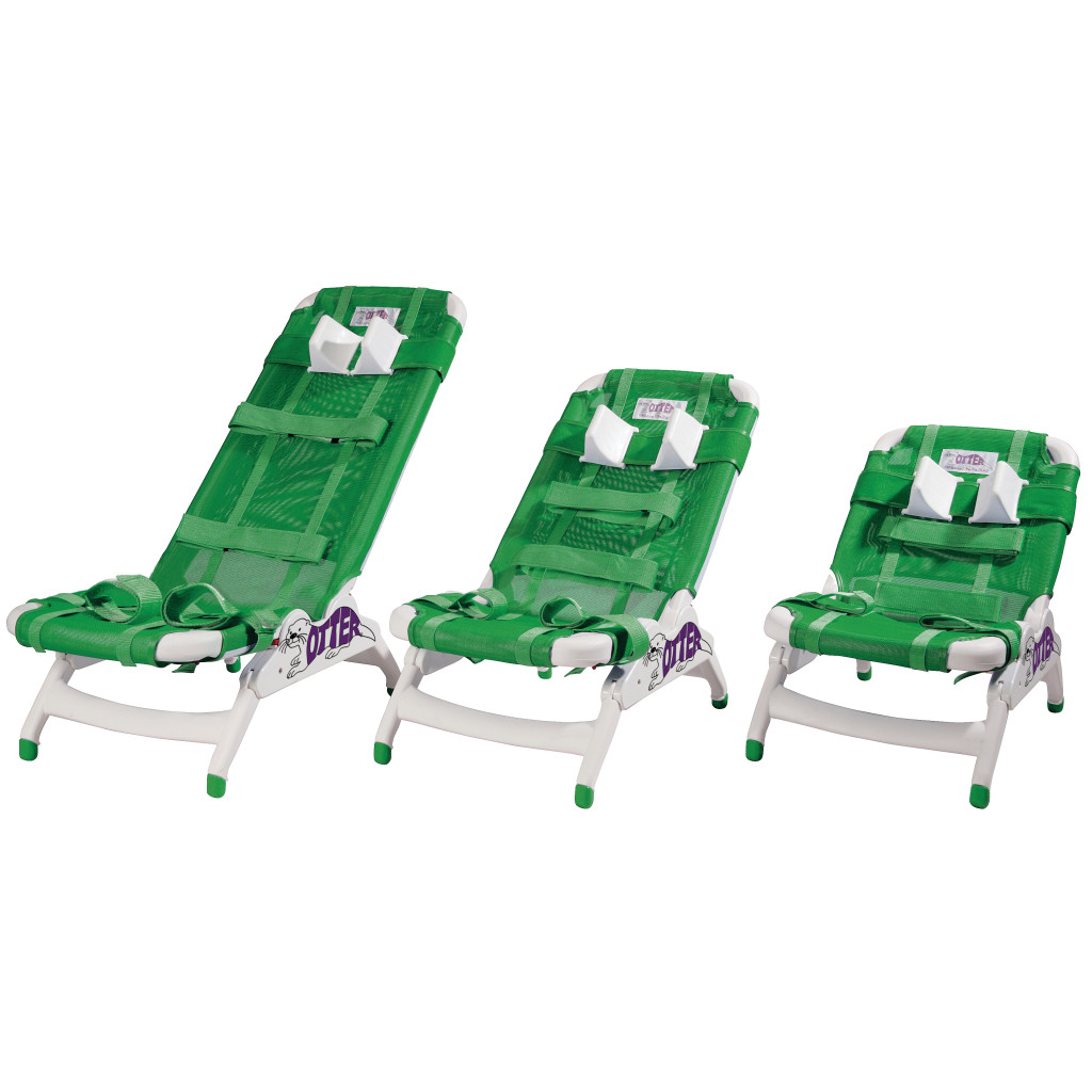 The Drive Medical Otter Bathing System, available in models OT1000 (small, up to 60 lbs), OT2000 (medium, up to 120 lbs), OT3000 (large, up to 160 lbs), and OT4000 (extra-large, up to 200 lbs), is a versatile pediatric bath chair designed to ensure safe and comfortable bathing for children with special needs, featuring a lightweight plastic frame with a choice of standard green vinyl-covered nylon fabric that dries quickly or soft blue and lavender polyester knit fabric with additional padding and a trunk strap for enhanced lateral support, both of which are removable and machine-washable for easy maintenance. The chair offers five angle adjustments (0°, 22.5°, 45°, 67.5°, and 90°) for the seat and back, adjustable with one-handed Uni-Bars even while the child is seated, and includes height- and width-adjustable head cushions that double as lateral supports, removable positioning straps for customizable placement, and leg straps to control abduction and adduction, with adjustable slip-resistant legs that raise the chair up to 7 inches for optimal positioning in a tub or shower, and a fold-flat design for convenient storage. Available as a single unit, this system meets safety standards and is ideal for home or clinical use, with the OT4000 model offering increased capacity for larger children. Drive Medical provides a one-year limited warranty covering defects in materials and workmanship under normal use for the original purchaser, ensuring reliable performance.