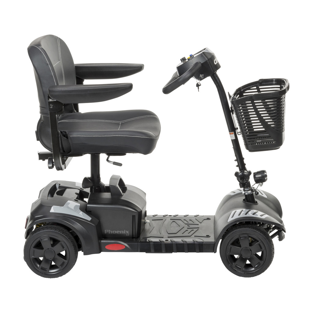 The Phoenix 4-wheel travel scooter combines a 350 lbs weight capacity with the take-apart portability of a travel scooter. The 4-wheel design and anti-tip wheels assist with overall stability for a more secure experience. This scooter also has a height-adjustable seat with flip-back and adjustable-width arms to accommodate varying body types. The seat also helps with portability by folding flat and allowing for easier transporting or storage. Your Phoenix 4-Wheel scooter can easily and quickly disassemble into five pieces.