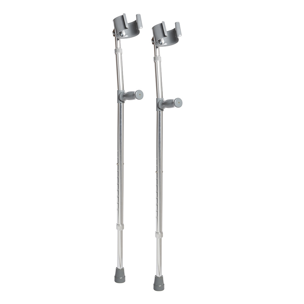 The Drive Medical Steel Forearm Crutches, available in model numbers 10403 (adult) and 10405 (tall adult), are durable mobility aids designed to provide reliable support for individuals with leg, knee, ankle, or foot injuries, offering enhanced stability compared to standard canes while avoiding the discomfort of underarm crutches. Crafted from high-quality steel with a 300-pound weight capacity, these crutches feature vinyl-coated, ergonomically contoured arm cuffs molded for comfort and stability, paired with durable vinyl hand grips and a hard plastic Ortho K handle for secure, comfortable use. Both leg and forearm sections adjust independently without tools, accommodating users from 5 feet to 6 feet 2 inches for the 10403 model (handle to floor range of 28 to 37 inches) and 5 feet 10 inches to 6 feet 6 inches for the 10405 model, ensuring a personalized fit. Extra-large tips enhance stability on various surfaces, making these crutches ideal for rehabilitation or long-term mobility needs. Drive Medical provides a limited lifetime warranty on the Steel Forearm Crutches, ensuring long-term reliability and customer satisfaction for this essential mobility aid.