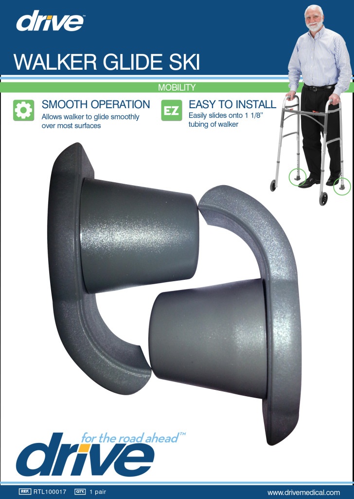 The Drive Medical Wheel Walker Ski Glides are designed to provide a smooth and effortless walking experience for individuals using standard walkers. Made from durable plastic, these glides reduce friction and allow for easy movement across various indoor and outdoor surfaces. They eliminate the need to lift the walker, reducing user fatigue and promoting a more natural walking motion. The curved design ensures smooth gliding while preventing the walker from catching on uneven surfaces. Item number RTL100017 is designed to fit walkers with 1-inch diameter tubing, while item number 10110 is compatible with walkers featuring 1 1/8-inch diameter tubing. Both models are easy to install without tools, attaching securely to the rear legs of the walker for enhanced stability and performance. Ideal for seniors and individuals with limited mobility, Drive Medical Wheel Walker Ski Glides offer a reliable solution for improved maneuverability and ease of use.