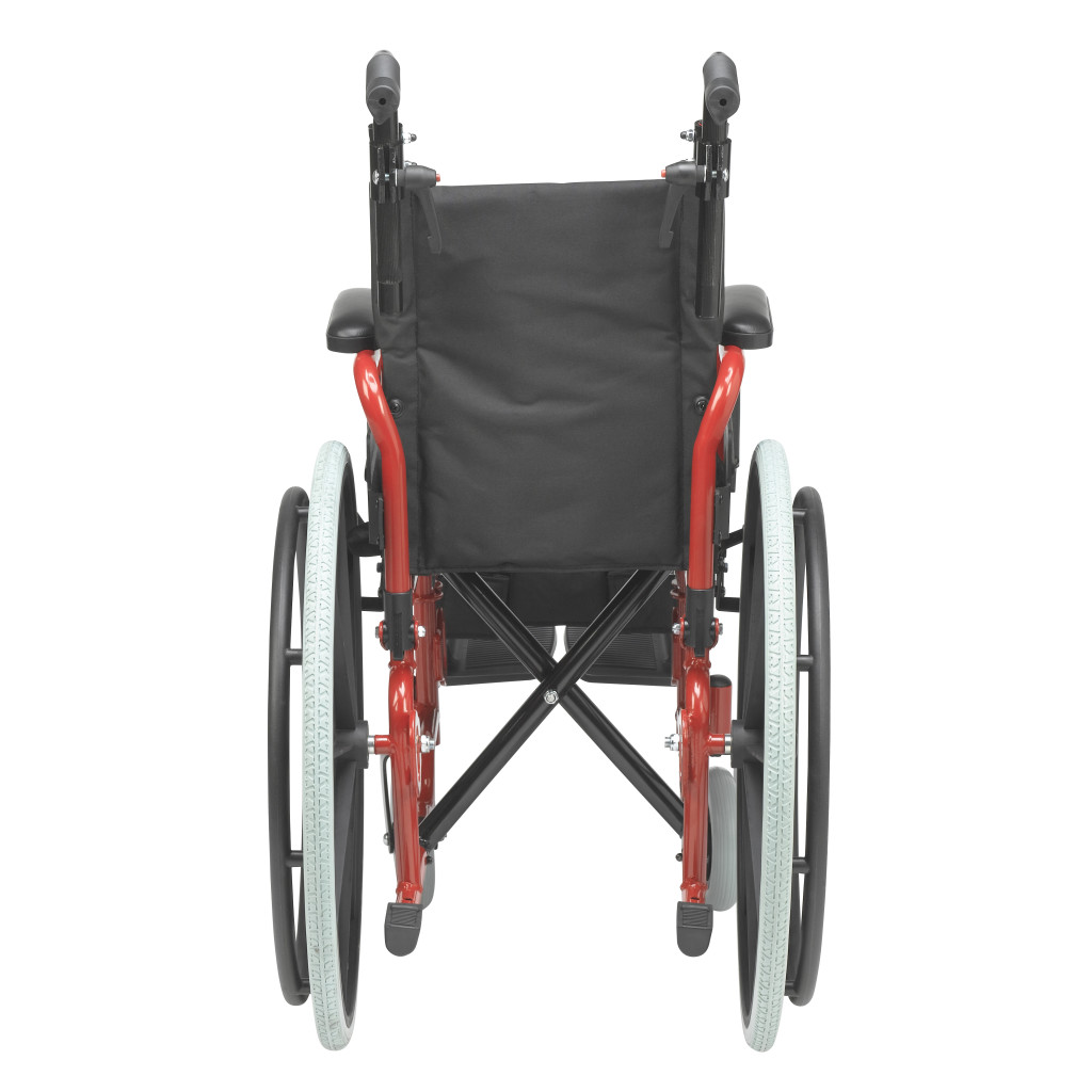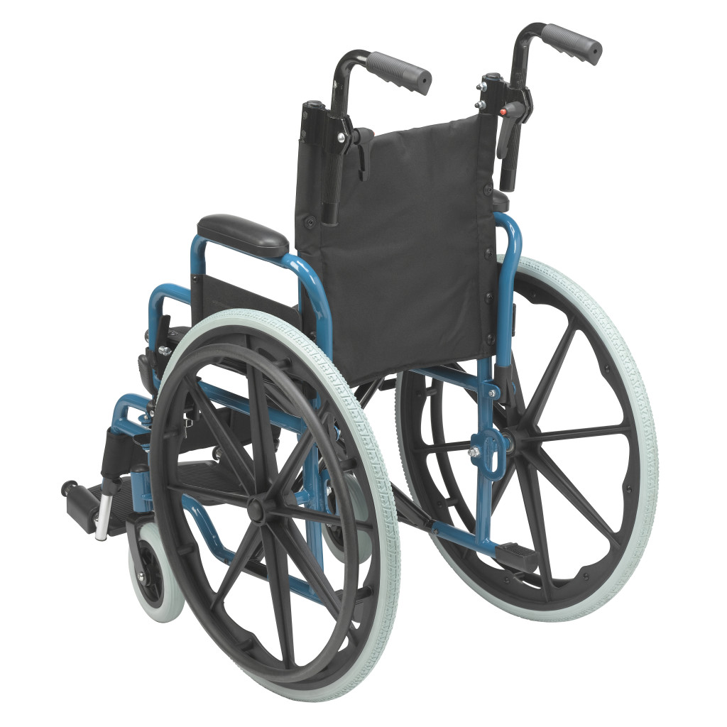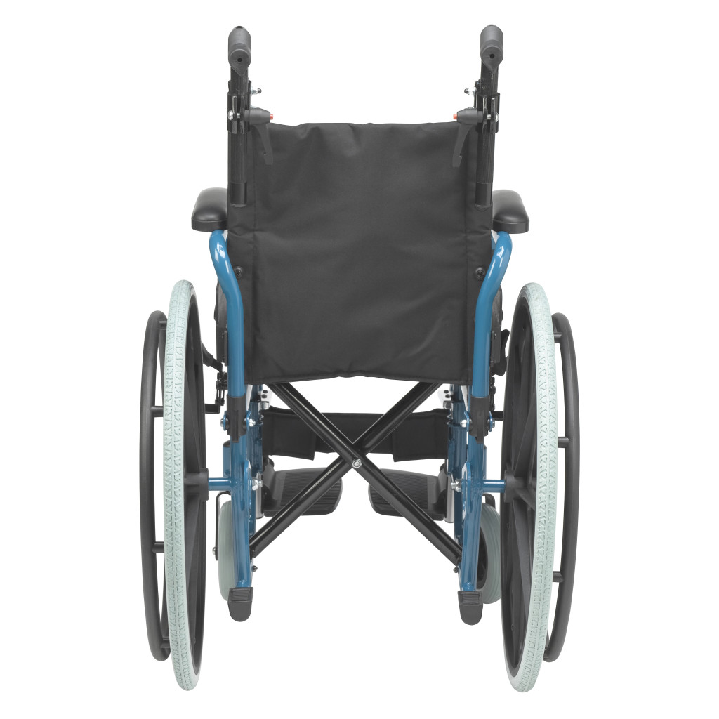 The Drive Medical Wallaby Pediatric Wheelchair, available in models WB1200-2GFR (12-inch seat, Fire Truck Red) and WB1400-2GJB (14-inch seat, Jet Fighter Blue), is a lightweight, foldable mobility solution designed for children, offering a weight capacity of 150 lbs and WC19 bus transit compliance for users between 50 and 80 lbs when used with the WB8021 transit bracket, featuring a durable steel frame with height-adjustable push handles for caregiver comfort, flip-back padded desk arms for easy transfers, and swing-away footrests with tool-free height adjustment and calf straps for therapeutic leg support. Equipped with a standard pelvic belt for positioning, push-to-lock wheel locks for safety, 22-inch rear wheels, and 6-inch front casters for excellent maneuverability, this wheelchair is ideal for active pediatric users in home or community settings, with optional accessories like headrest extensions, elevating leg rests, anti-tippers, and a Poziform chest harness available for customization. Available as a single pre-assembled unit, the Wallaby weighs approximately 37 lbs with footrests and meets rigorous safety standards for reliable performance. Drive Medical provides a one-year limited warranty covering defects in materials and workmanship under normal use for the original purchaser, ensuring confidence in its durability and functionality.