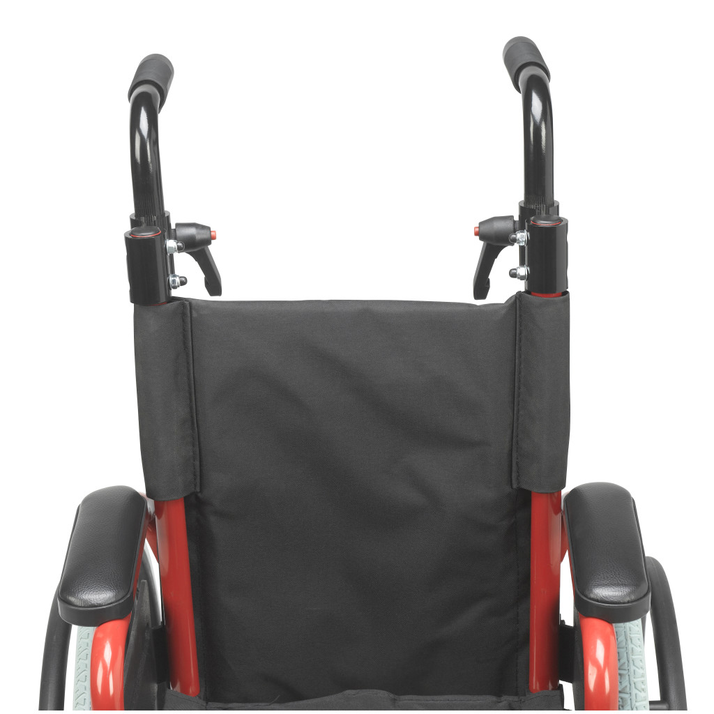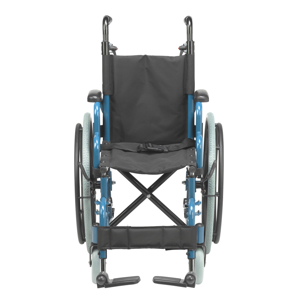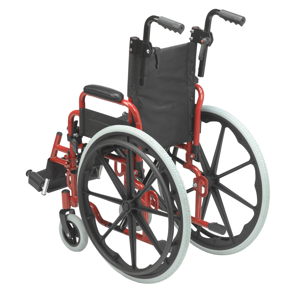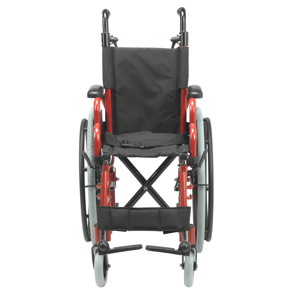 The Drive Medical Wallaby Pediatric Wheelchair, available in models WB1200-2GFR (12-inch seat, Fire Truck Red) and WB1400-2GJB (14-inch seat, Jet Fighter Blue), is a lightweight, foldable mobility solution designed for children, offering a weight capacity of 150 lbs and WC19 bus transit compliance for users between 50 and 80 lbs when used with the WB8021 transit bracket, featuring a durable steel frame with height-adjustable push handles for caregiver comfort, flip-back padded desk arms for easy transfers, and swing-away footrests with tool-free height adjustment and calf straps for therapeutic leg support. Equipped with a standard pelvic belt for positioning, push-to-lock wheel locks for safety, 22-inch rear wheels, and 6-inch front casters for excellent maneuverability, this wheelchair is ideal for active pediatric users in home or community settings, with optional accessories like headrest extensions, elevating leg rests, anti-tippers, and a Poziform chest harness available for customization. Available as a single pre-assembled unit, the Wallaby weighs approximately 37 lbs with footrests and meets rigorous safety standards for reliable performance. Drive Medical provides a one-year limited warranty covering defects in materials and workmanship under normal use for the original purchaser, ensuring confidence in its durability and functionality.